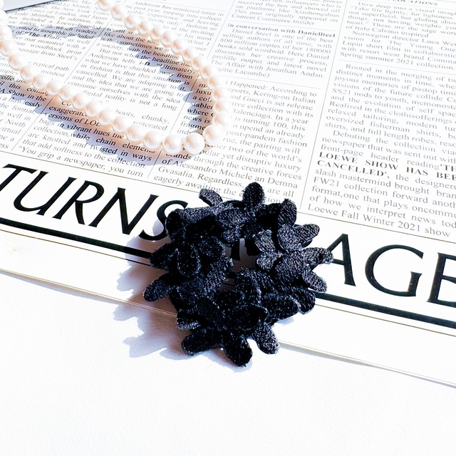 新作!フラワークチュール バレッタ 大ぶりで存在感のあるフラワーモチーフが印象的な、上品で華やかなバレッタです! ひとつ身につけるだけで、いつものヘアスタイルがぐっと華やぎます♪ カラーは ブラック・オフホワイト・ブルー の3色展開。 ✔ ブラック … シックでクールに ✔ オフホワイト … 清楚でやわらかな雰囲気に ✔ ブルー … 洗練されたアクセントに 結婚式や卒業・入学式などのフォーマルなシーンはもちろん、 普段のシンプルなコーディネートにも合わせやすいデザインです。 刺繍ならではの繊細さと、ハンドメイドならではの温かみ。 「大人のための華やぎアクセサリー」として、長く愛用していただけます。 さらに、裏側にはワイヤーを仕込んでいるため、花びらの角度を変えて動きをつけることができます。 ふんわり柔らかな表情にも、立体的で華やかな印象にも! サイズ:約15cm ※ご購入に当たっての注意事項 ◯カラー選択を行ってください ◯受注制作の為、ご注文、お支払いいただいたことを確認してから7〜14日ほどお日にちをいただいております ◯刺繍品の為糸の引っ掛けにはご注意ください ◯お手入れは軽く水で濡らした布で糸の縫い目に沿って優しく拭いてください ◯ハンドメイド品の為、一点一点の作品に多少の違いが生じることはご了承くださいませ