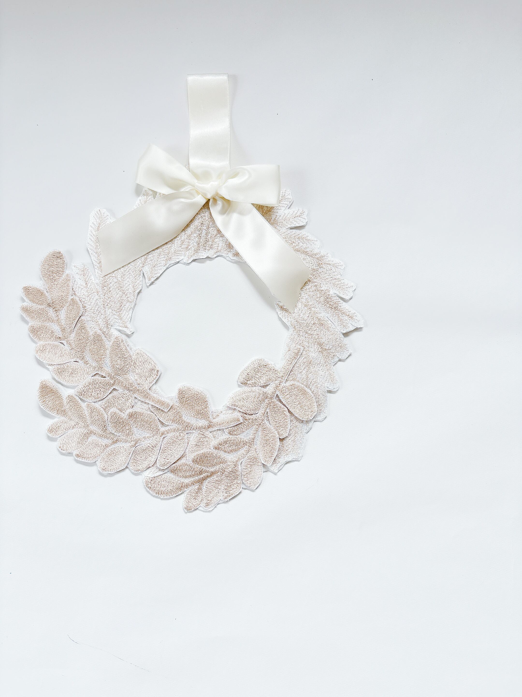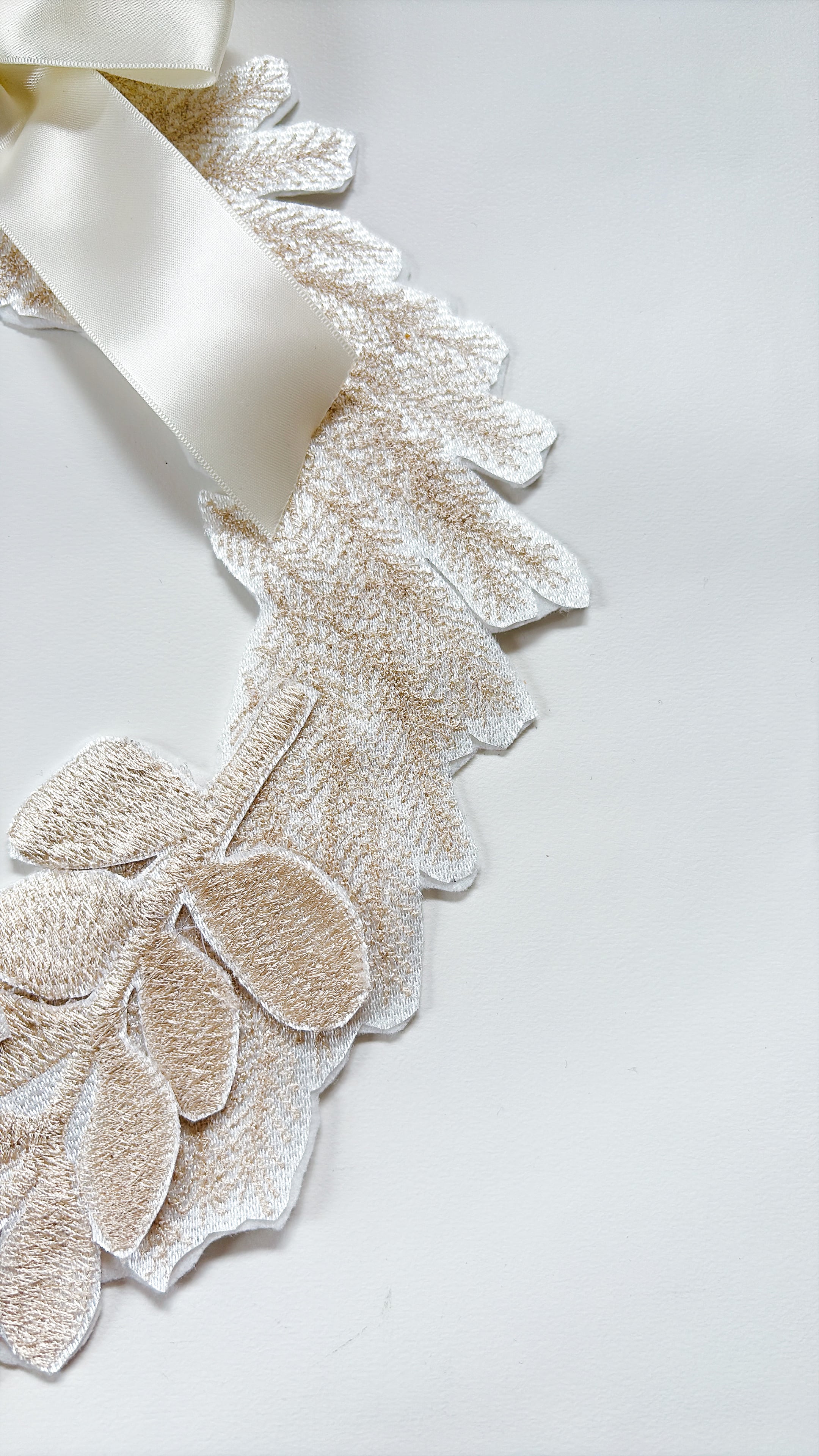 やわらかな生成りの糸で刺繍を重ね、光の角度で表情を変える上品なリース。