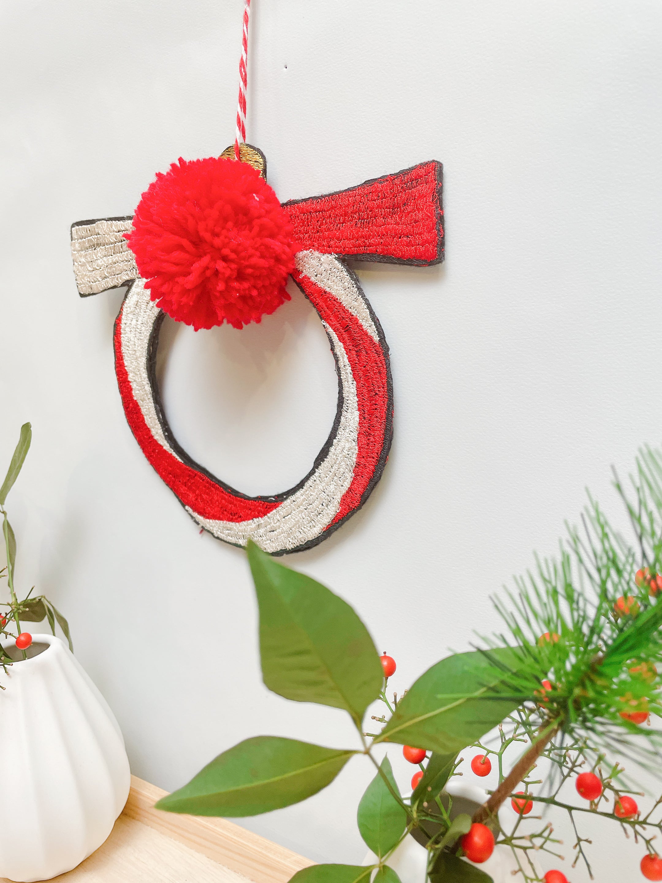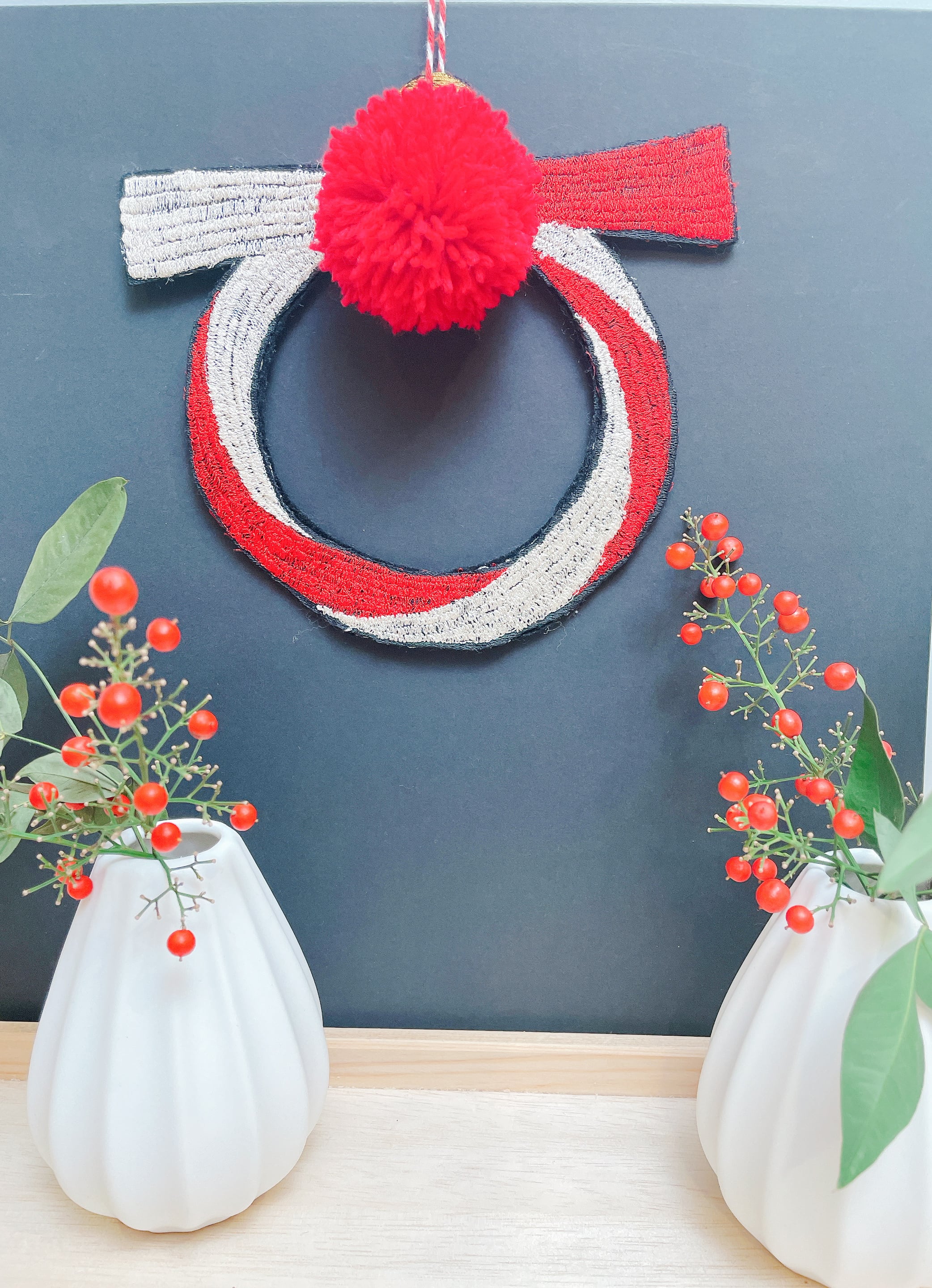この紅白の縁起の良さを刺繍を用いて、シンプルなしめ縄飾りを作りました。